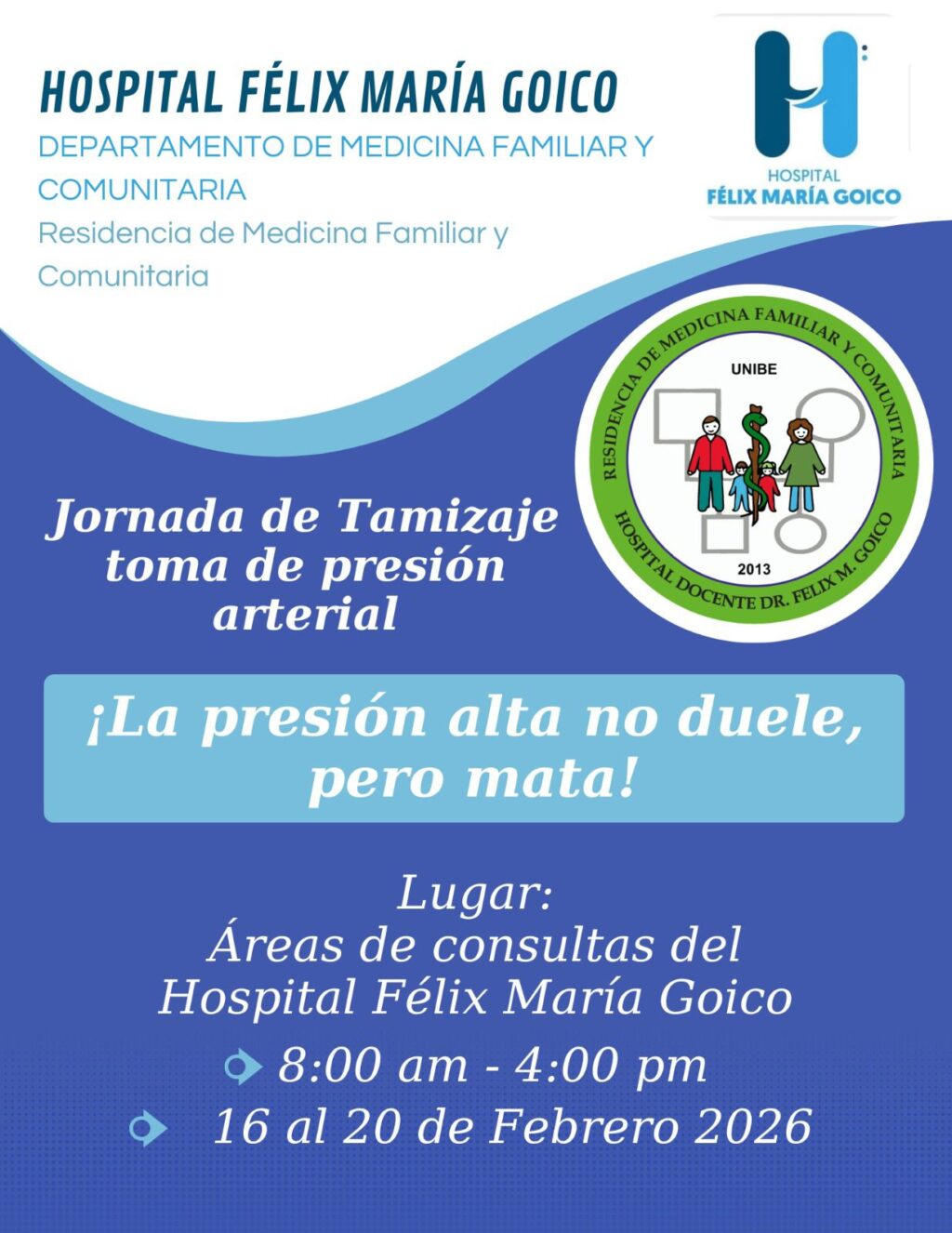 El Hospital Docente Dr. Félix María Goico, a través de su Residencia de Medicina Familiar y Comunitaria, informa la realización de una Jornada de Tamizaje de Presión Arterial, a efectuarse del 16 al 20 de febrero de 2026, en las áreas de consultas del centro de salud.