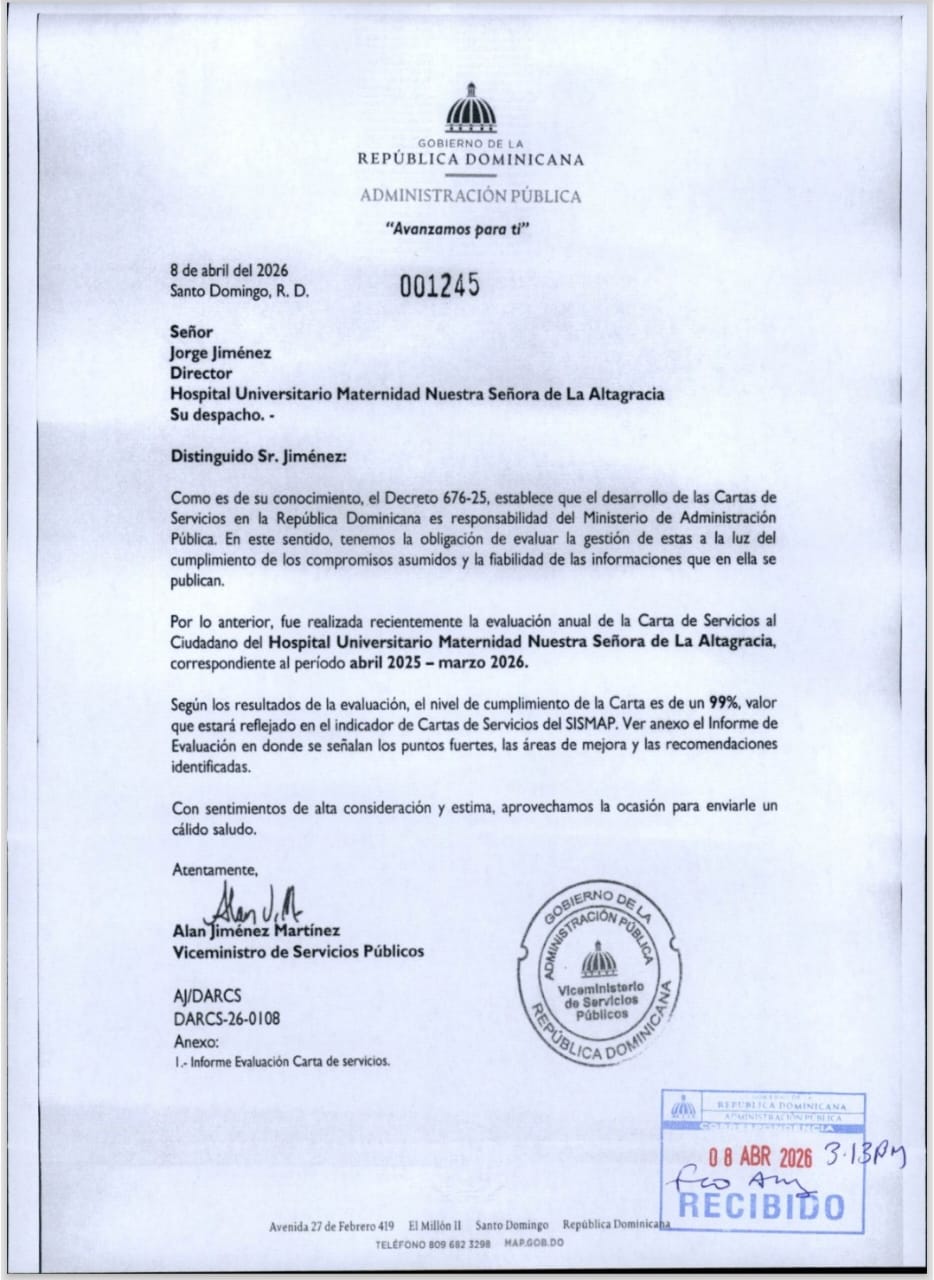 El Hospital Universitario Maternidad Nuestra Señora de la Altagracia (HUMNSA) obtuvo una calificación de 99 puntos en la evaluación por parte del Ministerio de Administración Pública (MAP), de la Carta Compromiso al Cuidadano en su versión 2024-2026.